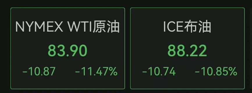国际原油市场方面,WTI原油失守84美元/桶,日内跌11.40%。布油跌超10%。