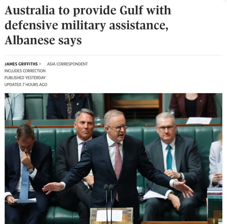 他说,政府的首要任务始终是保护澳洲人的安全。帮助海湾国家防御,其实也是在帮助当地的澳洲人。