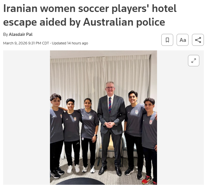 3月10日,据路透社和美联社报道,澳大利亚警方在深夜将5名伊朗女子足球运动员从球队下榻酒店秘密带离,并将她们转移至安全地点。随后,这些球员正式获得澳大利亚的人道主义庇护签证。