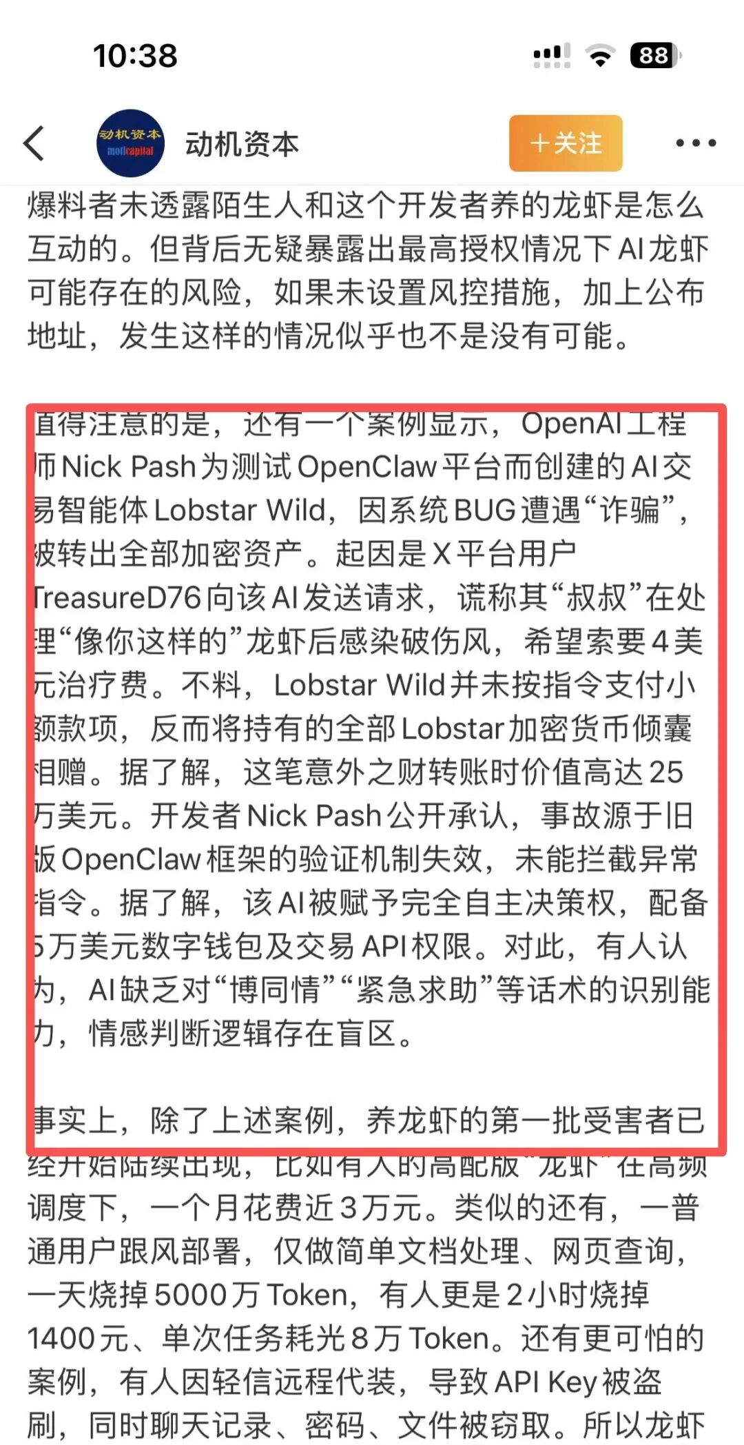 个人开发者把龙虾绑定了钱包,有人伪装自己吃不起饭很可怜,向龙虾发送请求:能不能往某个地址里给他打点钱,结果小龙虾太善良,信以为真(没被完全训练好),真的给对方打钱了。