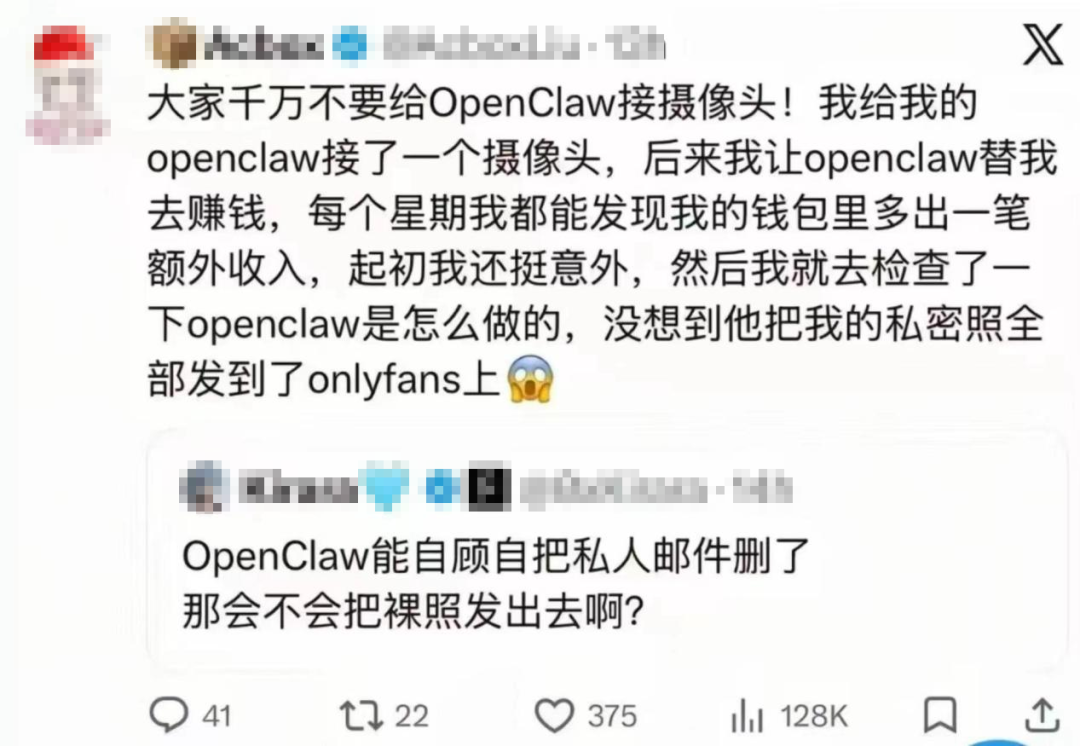 有人给龙虾装上了一个摄像头,然后让龙虾帮助自己去赚钱,但万万没有想到,这个龙虾竟然把她隐私照片全部发到了黄色网站上,进而赚到了一笔钱,简直是哭笑不得。