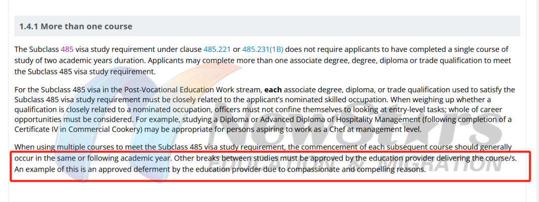 澳洲移民局又对485动手了,突然涨到4600澳币申请费这事刚结束,这次又是偷偷搞小动作,485工签中2年澳洲学习要求有小补充:如果用多个课程来满足2年学习,新课程跟旧课程要在同一年或者下一年开始,才能进行累计。