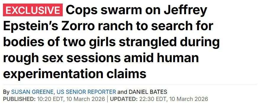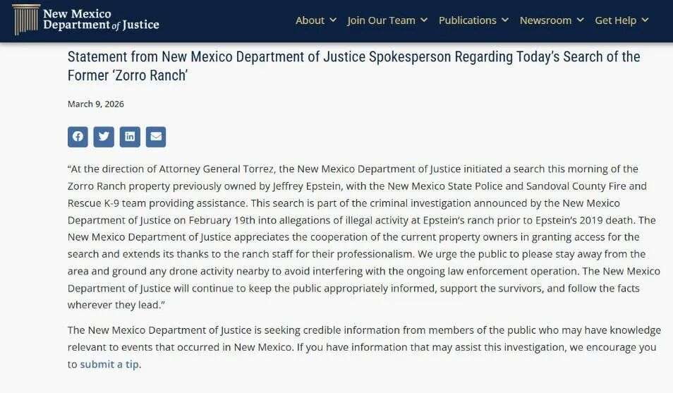 2026年3月9日周一,美国新墨西哥州政府的网站发布了一篇言简意赅的声明,宣布从当天上午开始,将对杰弗里·爱泼斯坦的佐罗牧场(Zorro Ranch)展开搜查,调查他在2019年去世前曾在这里进行的非法活动。