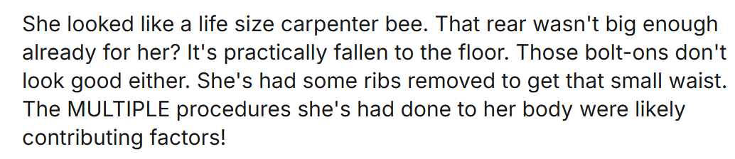 “活脱脱像只真人大小的蜜蜂。臀部难道还不够大吗?简直快掉到地上了,那些假体也难看得很...