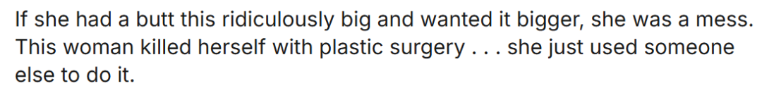 “拥有如此夸张的臀部了还想要更大,那她简直疯了。这个女人是靠整容把自己毁掉的…只不过她最终找到一个背锅人罢了。”