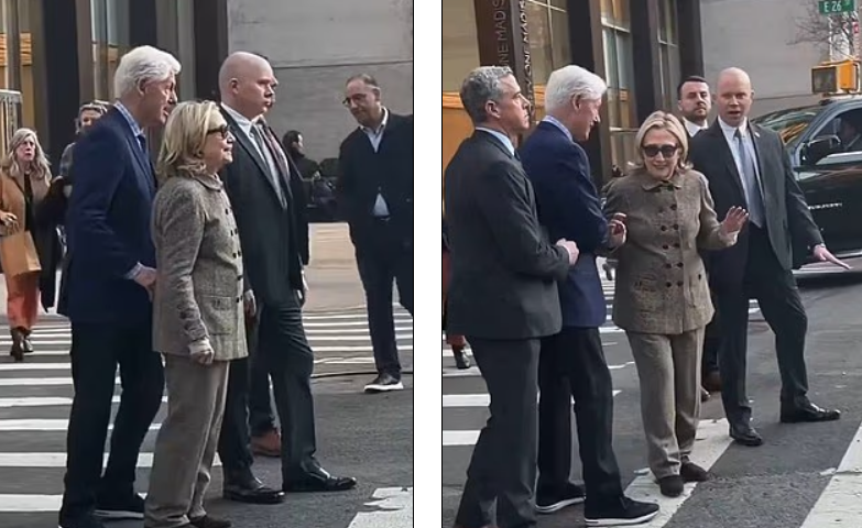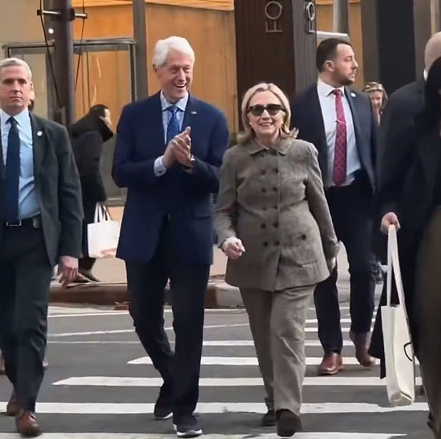 视频最开始的画面显得十分轻松:79岁的比尔·克林顿看起来心情不错,一边走一边拍着手,脸上带着笑容,而希拉里也神情放松,两人边走边聊天,看起来像是一对普通的老夫老妻在纽约街头散步。