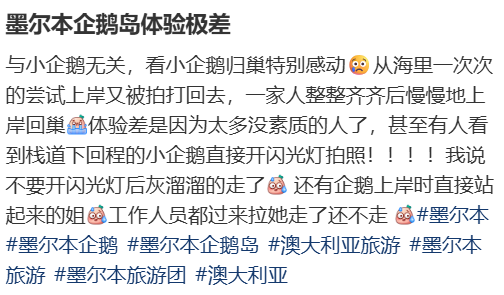 一直到最近,仍有不少去了企鹅岛游玩的华人,曝光在那里看到的“不文明”现象,甚至表示现场还有中文广播,提醒游客不要对小企鹅拍照。