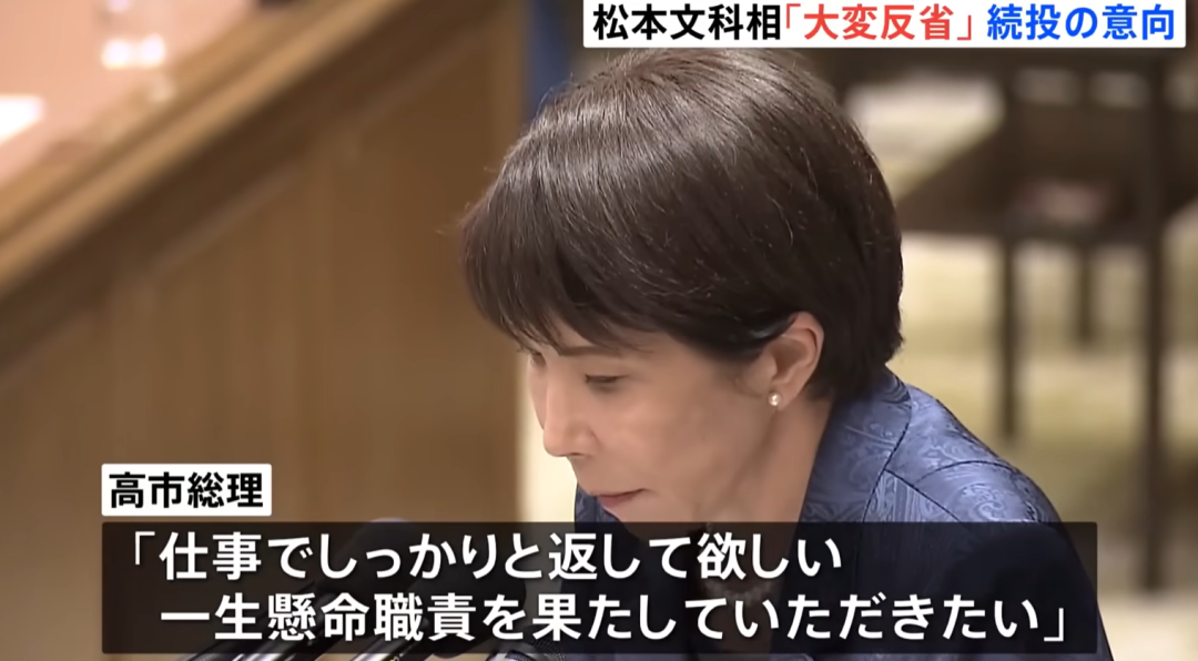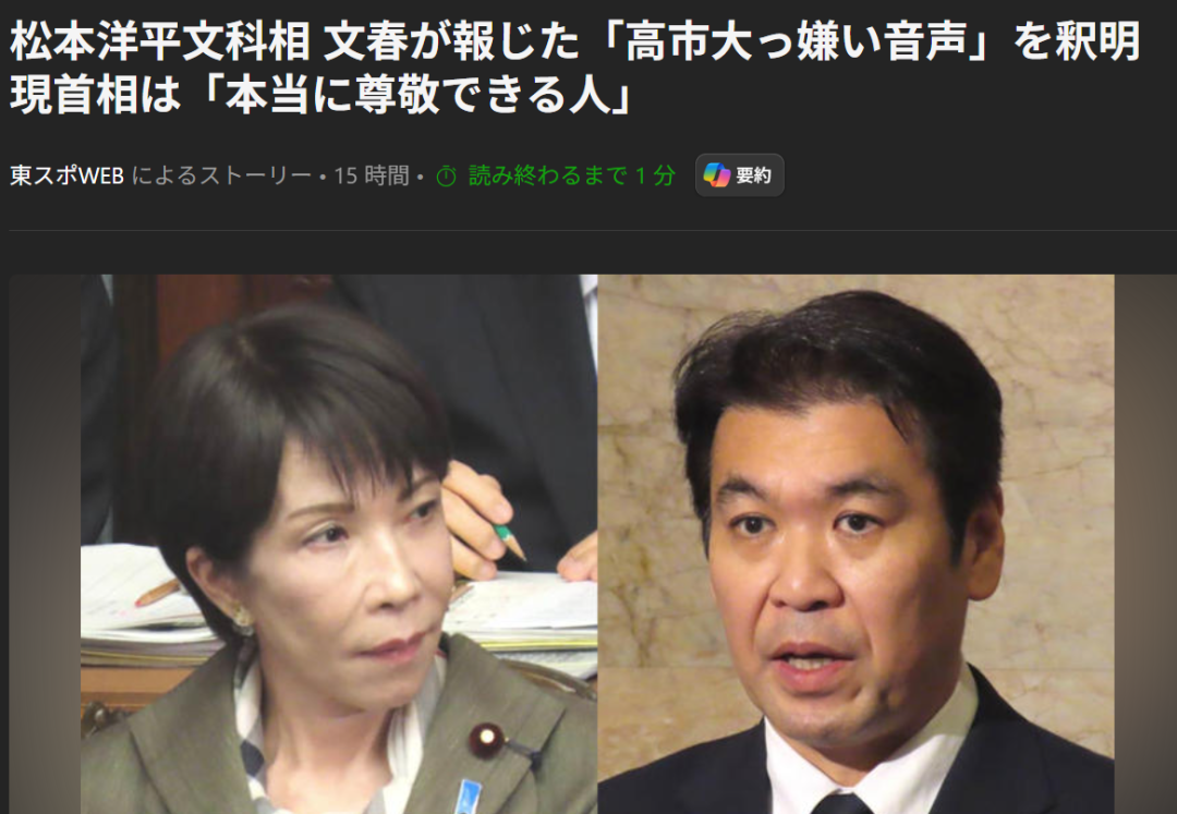 松本还进一步表示,目前作为文科大臣,亲眼见证高市总理的工作态度和决策能力,深感尊敬,认为高市具备引领日本的能力,他希望能全力支持高市的工作。
