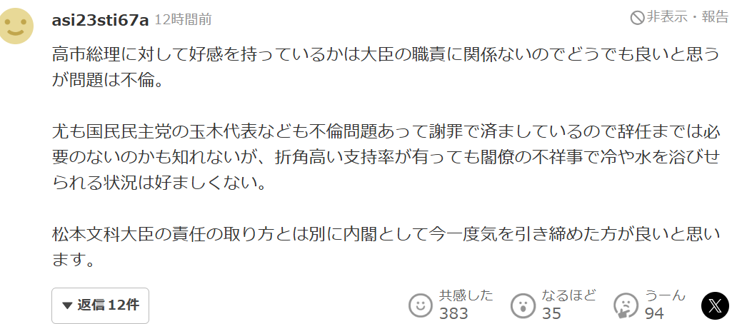 对此,日本网友表示先别谈跟高市的关系,先正视出轨问题赶紧辞职吧。因为松本担任的是面向青少年的文科大臣,都出轨了还担当什么大臣。