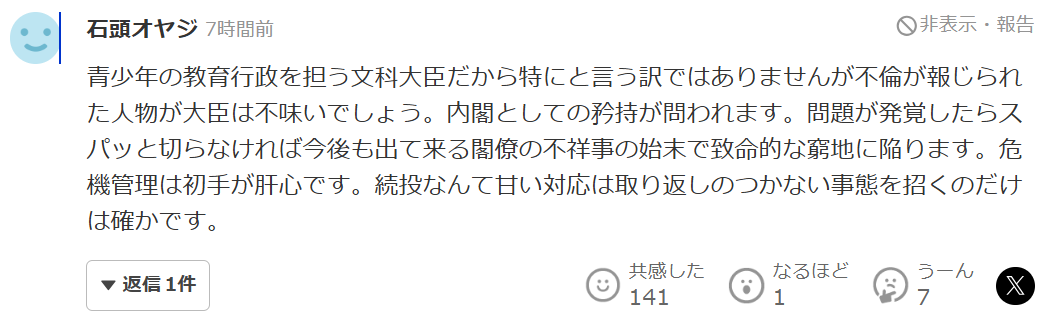 “虽然不一定是因为文科大臣负责青少年的教育事务,但被报道出不伦行为的人担任大臣显然不妥。这关系到内阁的自我矜持。一旦问题曝光,如果不能果断处理,今后其他阁僚的不祥事也将难以收拾,可能陷入致命困境。危机管理的关键在于第一步,继续留任这种宽松处理,只会导致无法挽回的局面。”