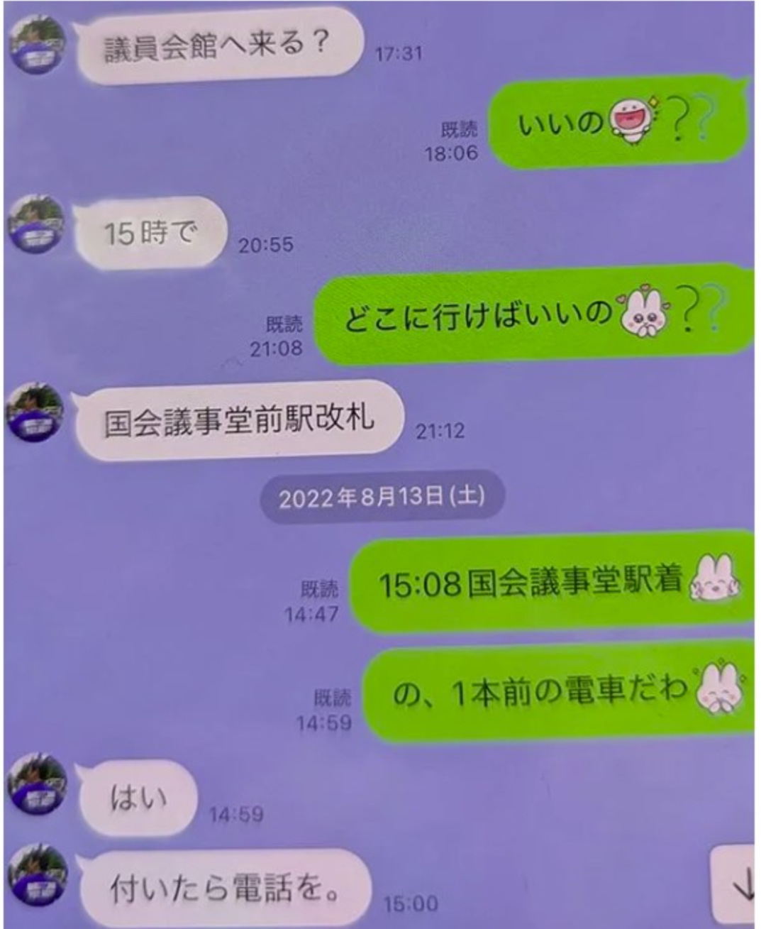 “15点能来议员会馆吗?到国会议事堂前站,去出口那里就可以。到了打电话给我。”