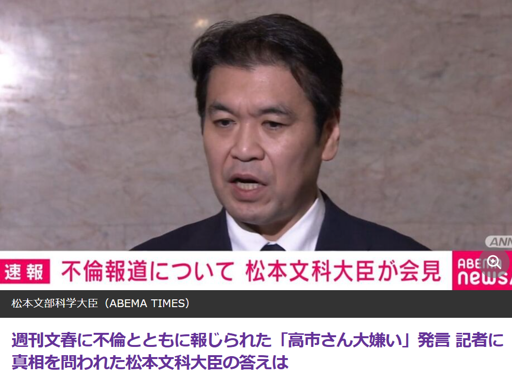 根据日本《週刊文春》的报道,高市内阁的文部科学相松本洋平在已婚状态下与另一名已婚女性保持不正当关系,并曾将该女性带入议员会馆以及情人旅馆做不可名状的事,涉及明显的公私混同行为。