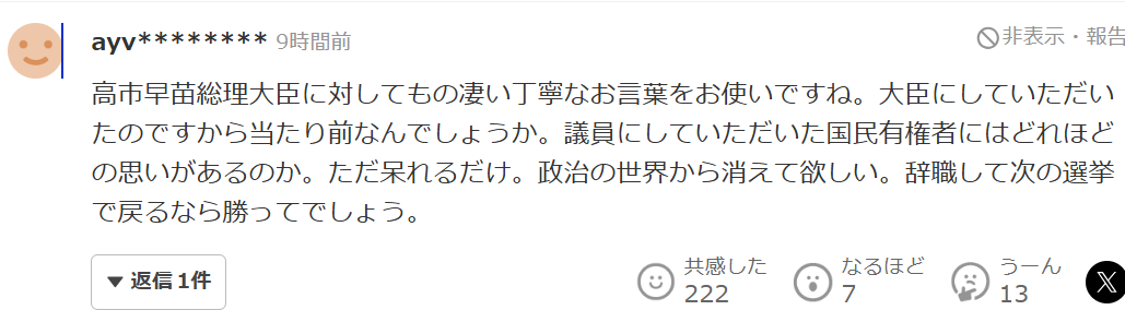 “对高市早苗总理使用极其恭敬的措辞,这或许是因为被任命为大臣,本就理所当然。但对那些让他成为议员的国民选民,他到底怀有多少感情呢?令人只能感到无奈。真希望他从政治世界消失。如果辞职后再参加下一次选举,也许还能赢得胜利。”