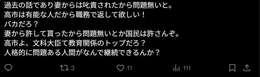 “他说这是过去的事情,而且已经被妻子责备过,所以没问题。但国民可不会因为妻子原谅就觉得没事。高市总理觉得他有能力,希望他能通过职务体现出来,但这逻辑也太荒唐了。文科大臣可是青少年教育的最高负责人,为什么一个在品格上有问题的人还能继续担任这样的位置?”