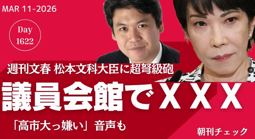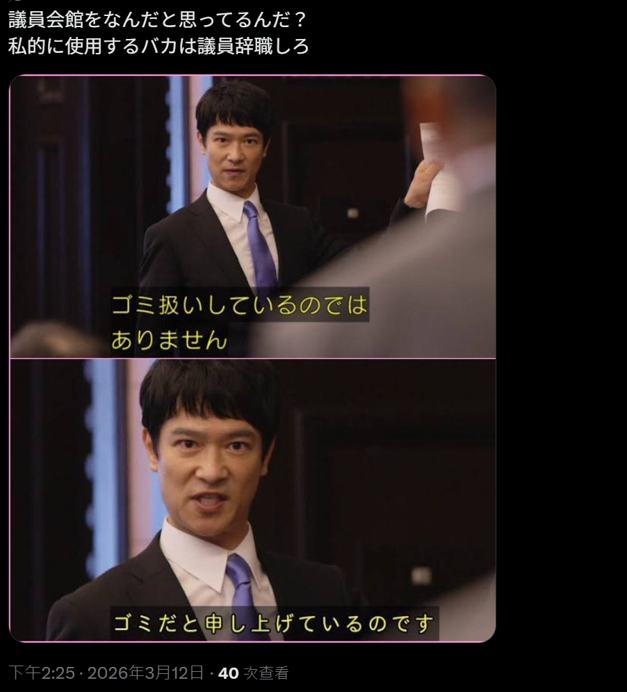 一个出轨丑闻缠身的人,竟然还能堂而皇之地坐在文科大臣的位置上;一个曾口出“讨厌高市”的人,却要在装模做样毕恭毕敬地卖力工作;议员会馆被当作私用场所,公私界限全然不明……