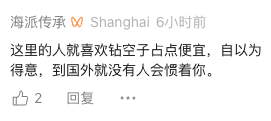也有人评论:“这里的人就喜欢钻空子占点便宜,自以为得意,到国外就没有人会惯着你。”