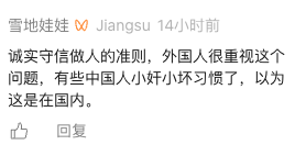 还有网友感叹:“诚实守信做人的准则,外国人很重视这个问题,有些中国人小奸小坏习惯了,以为这是在国内。”