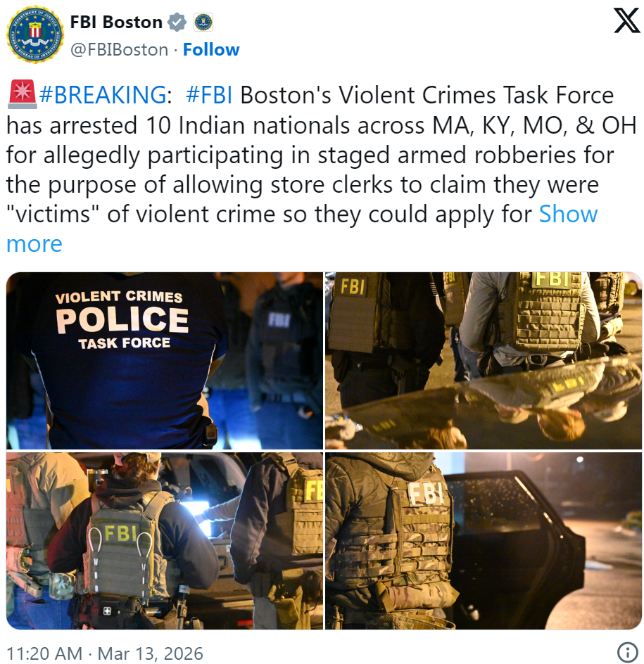 美国联邦检察官办公室周五(3月13日)宣布,11名印度公民因涉嫌伪造便利店武装抢劫案,以此申请U类签证(犯罪受害者签证)留在美国,被正式起诉。