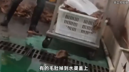 期间,有一块毛肚掉到了臭水沟的渠盖上,而工作人员也是毫不犹豫捡到毛肚堆里面。