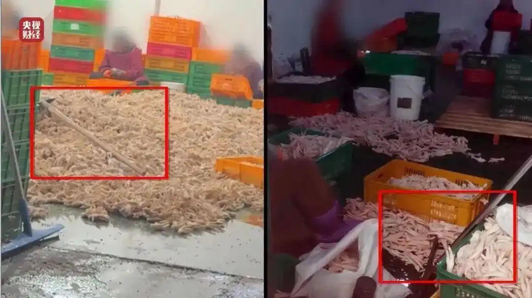 还没处理的鸡爪就直接被堆在地上,被工人踩来踩去。