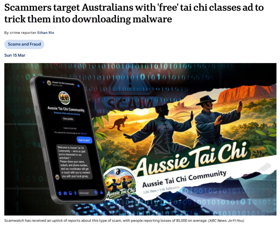 骗子在社媒页面上以“免费太极课”为幌子。人们加入之后会收到电话或讯息,让他们下载一个软件来注册课程。