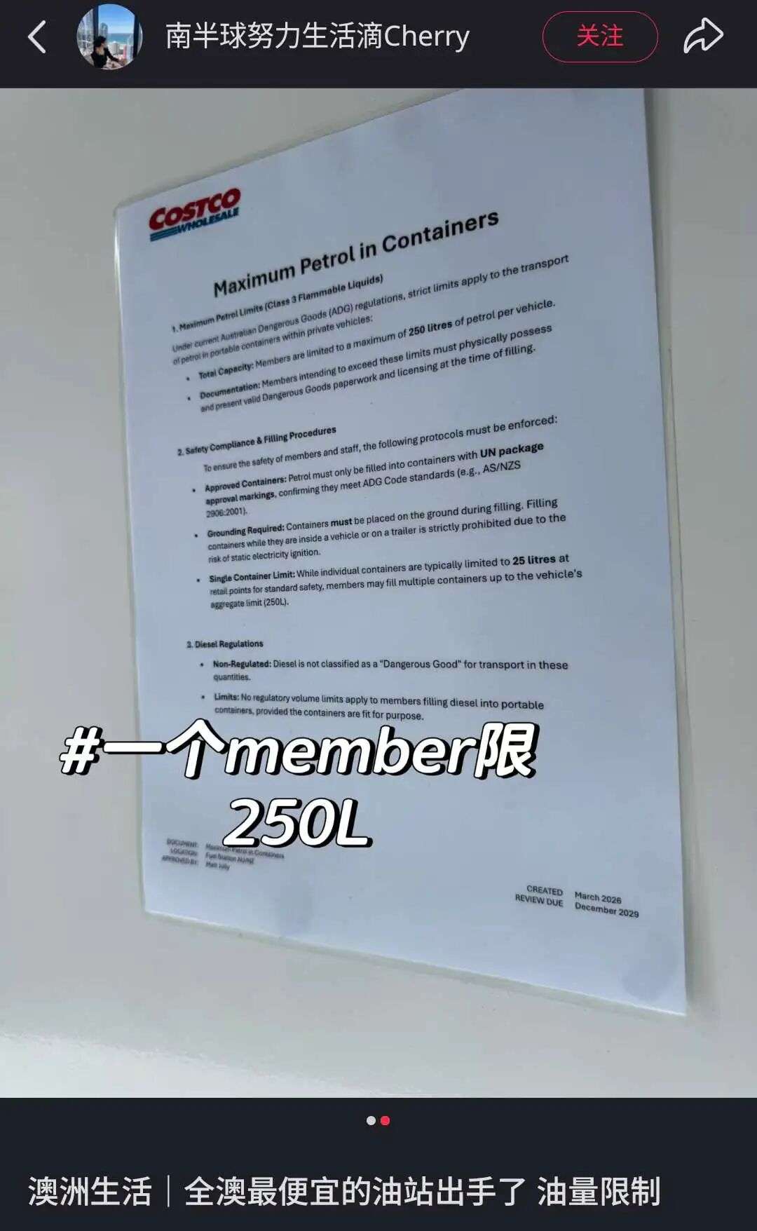 据这名居住在昆州的华人朋友发文说说,她家附近的这家Costco已经实行了油量限制: