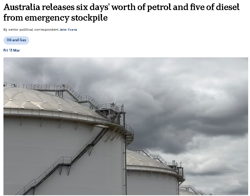 (上周澳洲从紧急燃油储备中释放大约 6天用量的汽油 和5天用量的柴油)