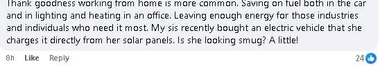 幸好现在在家办公越来越普遍了。这样既省了开车的油,也减少了办公室的用电和取暖。能源可以留给真正需要的行业和人。家里人最近买了电动车,直接用屋顶太阳能充电。