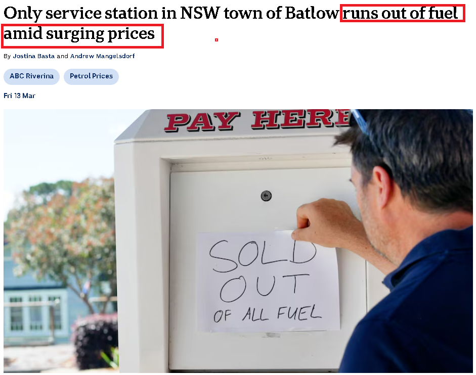 (上周初,新州雪山地区小镇Batlow唯一的一家加油站已经没有燃油可卖)