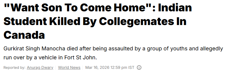 据多家媒体报道,一名来自印度中央邦乌贾因(Ujjain)的23岁留学生Gurkirat Singh Manocha,于3月14日在加拿大BC省Fort St. John遭到一群青年袭击,并被车辆碾压,最终因伤势过重在医院不治身亡。