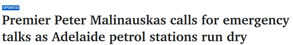 周一,南澳州长Peter Malinauskas召集了与行业和农业负责人的危机谈判。他表示,目前的短缺是由需求而非供应不足所驱动的。他指出,澳大利亚有37天的汽油储备和30天的柴油储备,全国的燃料安全并未立即受到威胁。