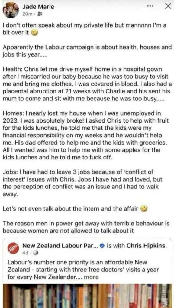 当天,Chris Hipkins的前妻Jade Paul(个人账号名Jade Marie)在自己私人Facebook页面发布了一条帖子,对她与Hipkins婚姻期间的一些经历提出指控。