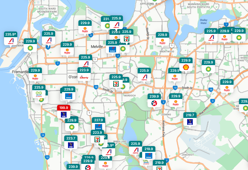 最便宜的加油站位于Gracetown的Gracie's General,价格为199.0澳分。珀斯都会区最便宜的是Nollamara的Vibe outlets加油站,价格为199.5澳分,紧随其后的是Hamilton Hill和Mt Helena的加油站,价格为199.9澳分。柴油价格则普遍维持在每升240澳分以上。