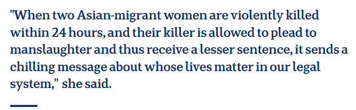 她批评检方去年同意林晓正承认过失杀人,而不是让案件进入谋杀罪审判。“两名亚裔移民女性在24小时内被残忍杀害,凶手却只被判过失杀人,刑期还这么轻,这传递了什么信息?我们的法律系统里到底谁的生命重要?这不仅加深了性工作者面临的污名化,也让我们对这些本应保护我们的机构失去信任。”