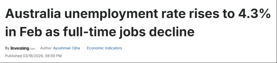 由于全职工作岗位减少,澳大利亚2月份失业率升至4.3%。