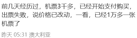 就在这昨天,社交平台上不少用户纷纷吐槽,短短一天之内,中国和澳洲之间的机票票价出现了大幅波动!