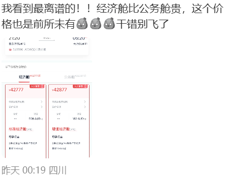 甚至出现经济舱价格超过公务舱的情况,让人直呼“离谱”。