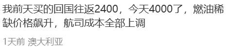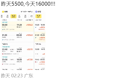 有旅客分享,自己前几天刚买的往返机票仅需2400元,如今同一航班价格已经几乎翻倍;