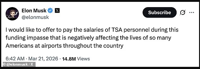 有媒体初步测算,按目前约5万名TSA员工规模计算,每周薪资支出接近5000万美元。若政府停摆持续,相关成本将持续累积,按月计算或接近2亿美元,不知道大富豪马斯克有没有这个计划?