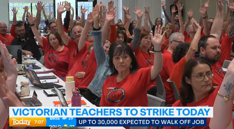 今天维州的学校虽然说的是依然正常开放,但谁都知道,孩子就算送去了也没有老师上课。因为维州学校的老师,大部分都已经涌向了墨尔本CBD的街头。
