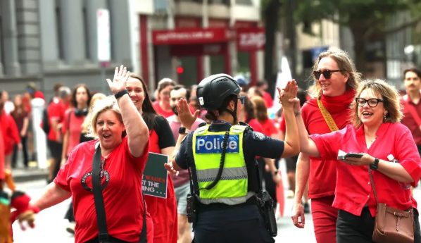 今天早上,墨尔本CBD的Russell和Victoria Street交汇处,成千上万身穿红色T恤的教师以及部分学生家长开始聚集。毫不夸张地说,今天早上就连公共交通上都被红色T恤给挤满了。