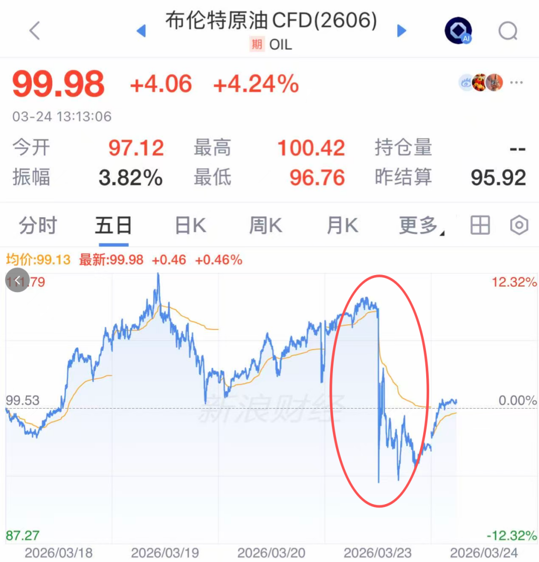 3月23日晚美股开盘前,美国总统特朗普突然在社交平台上宣布,将暂停对伊朗能源设施的打击,为期五天,并称自己与伊朗方面进行了富有成效的对话。这番言论发布之后,美股瞬间拉升,国际油价直线跳水,贵金属迅速反弹。