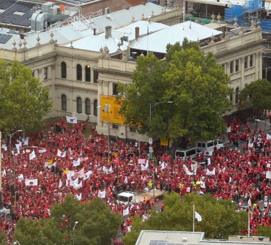 在拥有3万名成员的工会队伍中,预计三分之一的成员将从维州工会大厦(Victorian Trades Hall)游行至州议会举行集会。