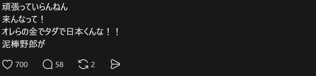 “谁稀罕你努力。别来日本!别拿我们的钱白来日本!你这个小偷混蛋。”