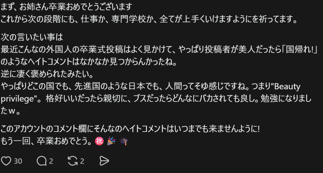 从毕业典礼的鲜花到电车上的辱骂,再到网上发帖日本人恶评,活脱脱演变成了一场“电子赛博遣返”大赏。这种极端的双标背后,不仅是外貌特权的狂欢,更是日本部分网民日益狭隘的社会防卫心理。