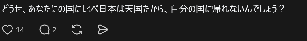 “反正和你的国家相比,日本就像天堂一样,所以你才回不了自己的国家吧?”