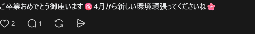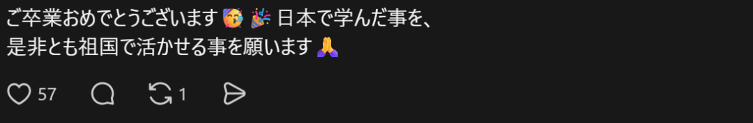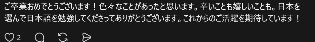“恭喜毕业!想必经历了很多事情吧,有辛苦的,也有开心的。感谢你选择日本并学习日语。期待你今后的发展与表现!”