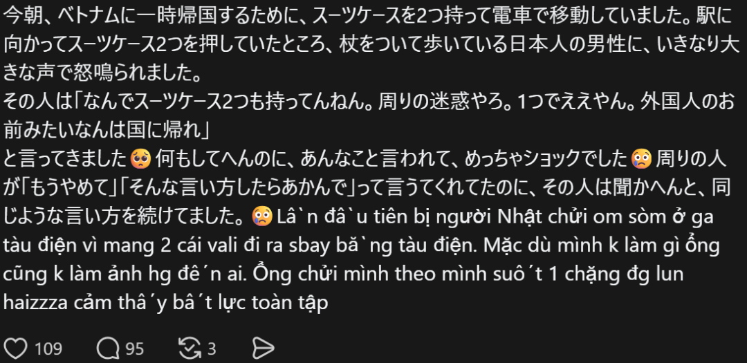 “今天早上我要暂时回越南,所以带着两个行李箱坐电车去机场。去车站的路上我推着两个行李箱走,一个拄着拐杖的日本男人突然大声对我吼。