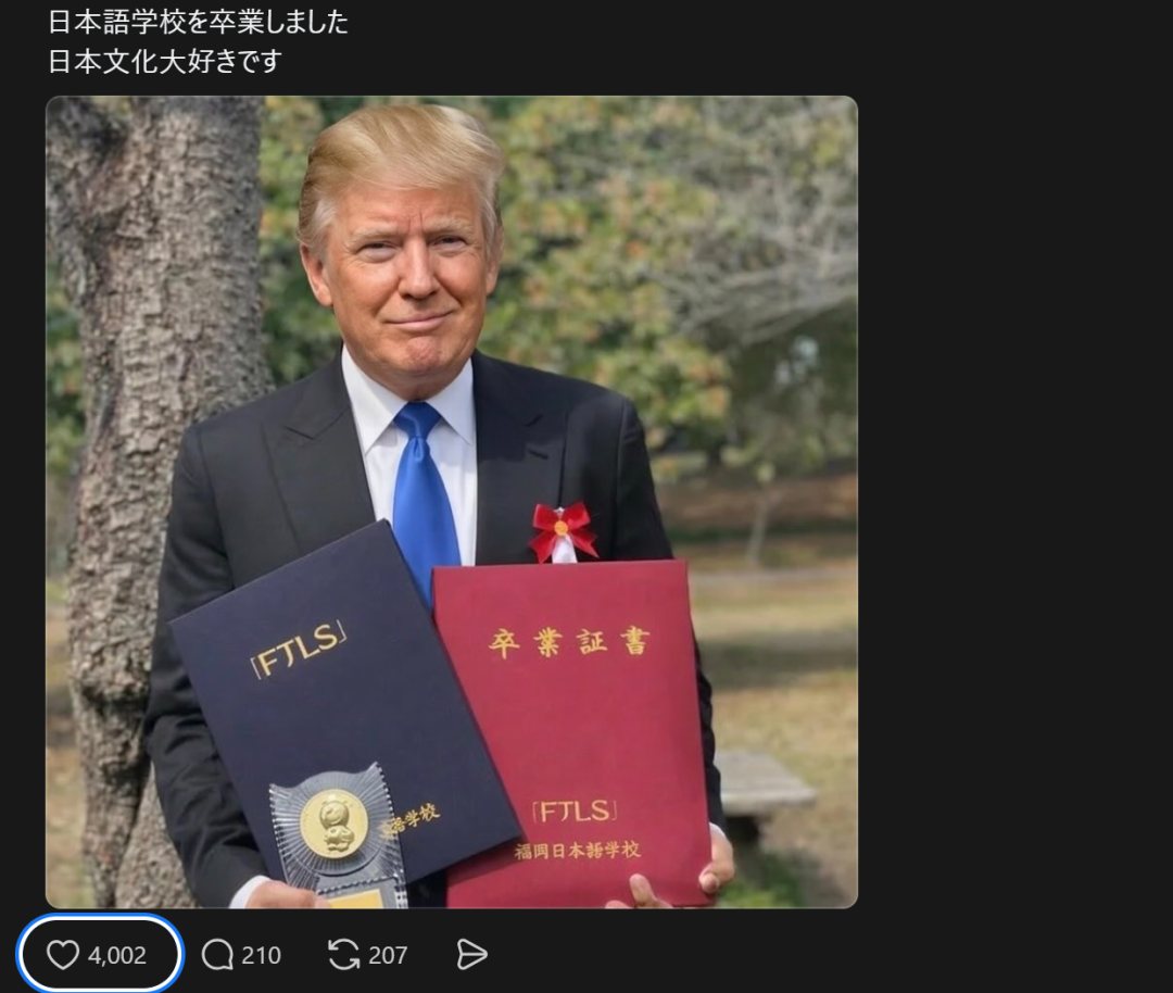 “滚回自己的国家”这个梗出来后,一些网友开始花样整活。比如用AI生成特朗普语言学校毕业的照片进行投稿。