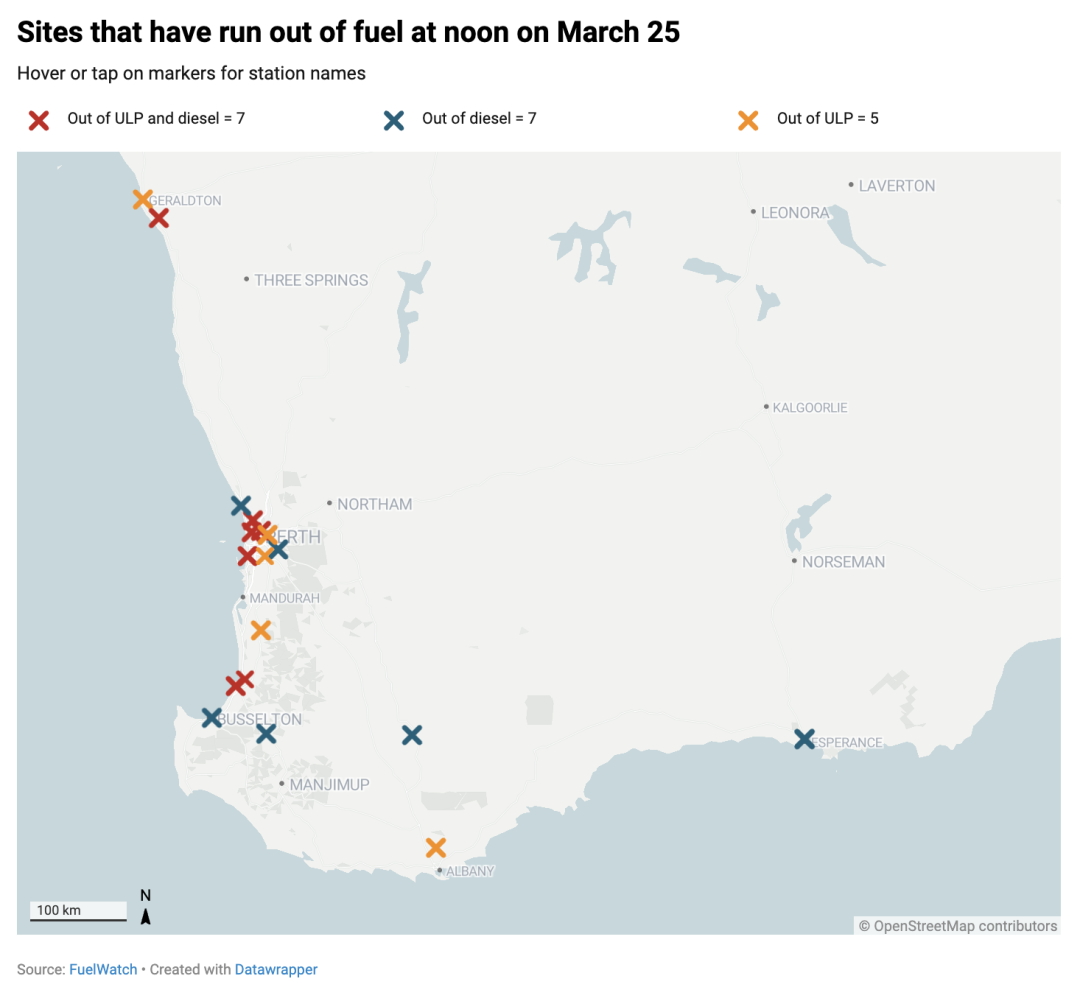 由于中东战乱,珀斯和西澳大利亚州部分地区的加油站出现燃油短缺,该州已因燃油短缺而发布“黄色预警”。